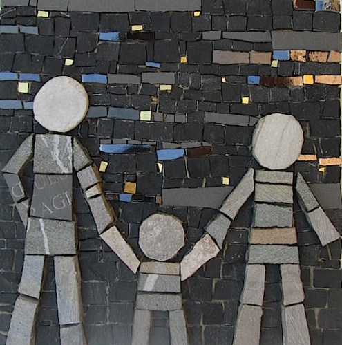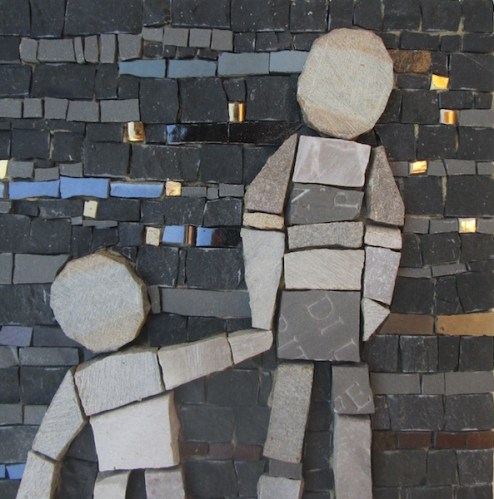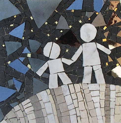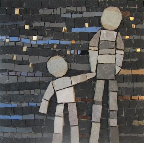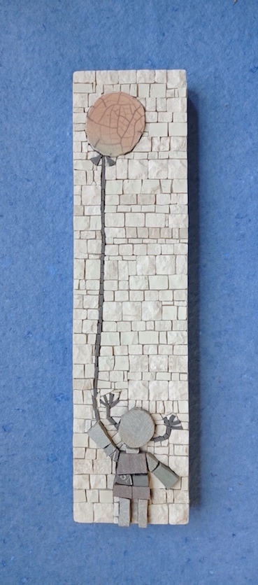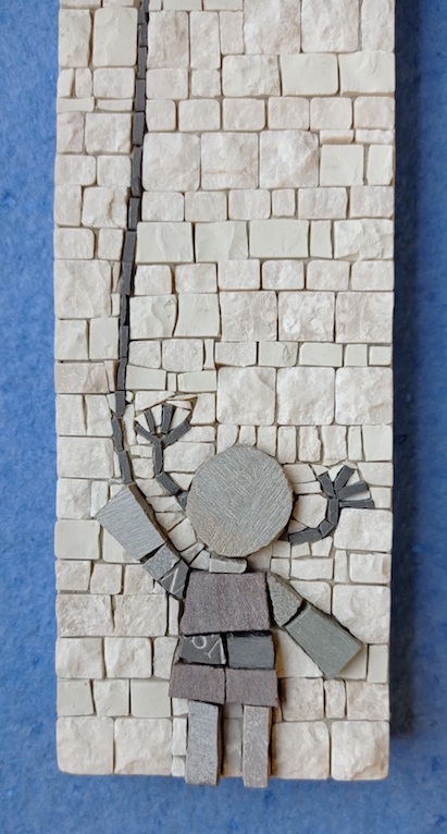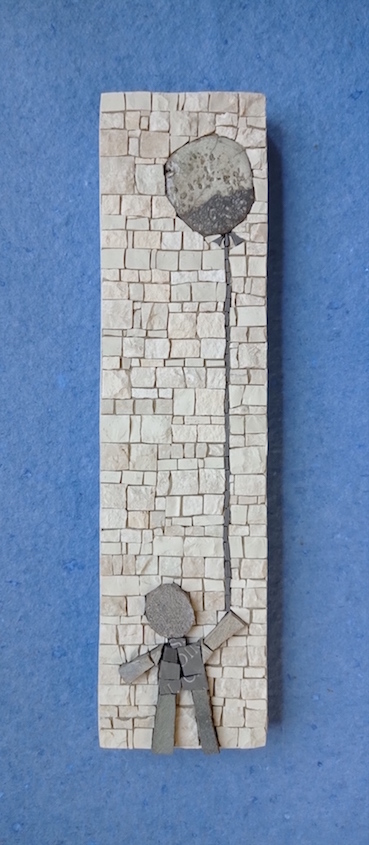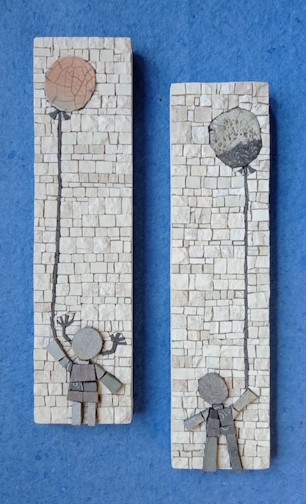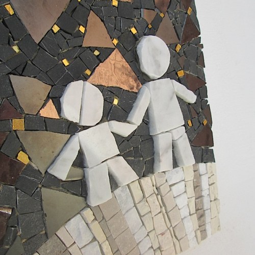 These tiny “mosaic stories” are made using the traditional tools of the trade (chisel and hammer) along with fragments of marble, natural stones and recycled materials.