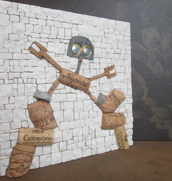 Dopo tanti robottini di pietra ho pensato di adottare altre soluzioni sostituendo i ciottoli di mare e i frammenti di cotto con montagne di tappi di sughero ritagliati a mano e sagomati per essere accatastati gli uni sugli altri e diventare le insolite “rocce” sulle quali far arrampicare i miei Robotap.