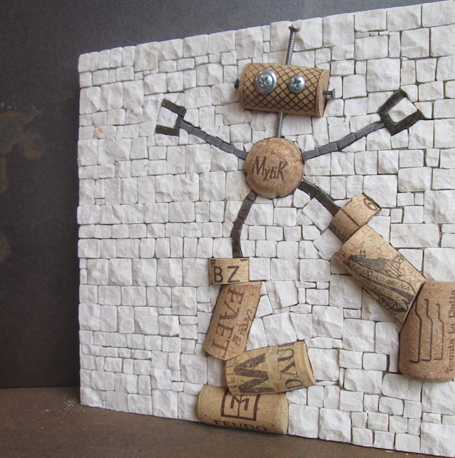 After so many little stone robots I thought of adopting other solutions by replacing the sea pebbles and terracotta fragments with mountains of hand-cut and shaped cork stoppers to be stacked on top of each other and become the unusual “rocks” on which my Robotaps climb.