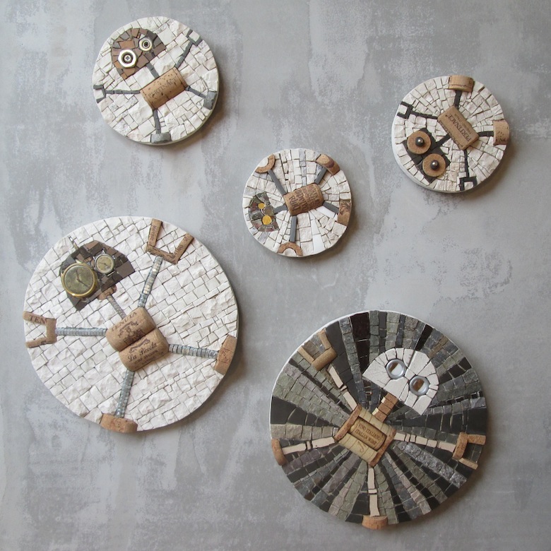 Io sono un’artista del mosaico e attraverso la mia tecnica ho creato, giorno dopo giorno, tanti robottini, fatti di pietra, ceramica, smalto di vetro e sagome di legno.