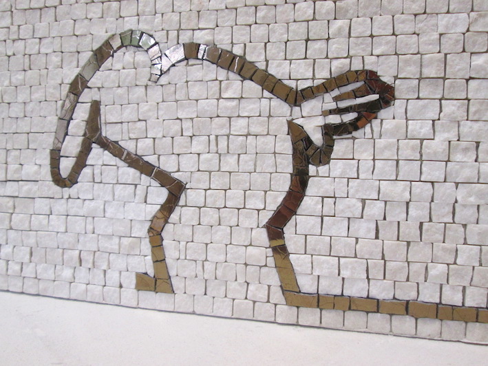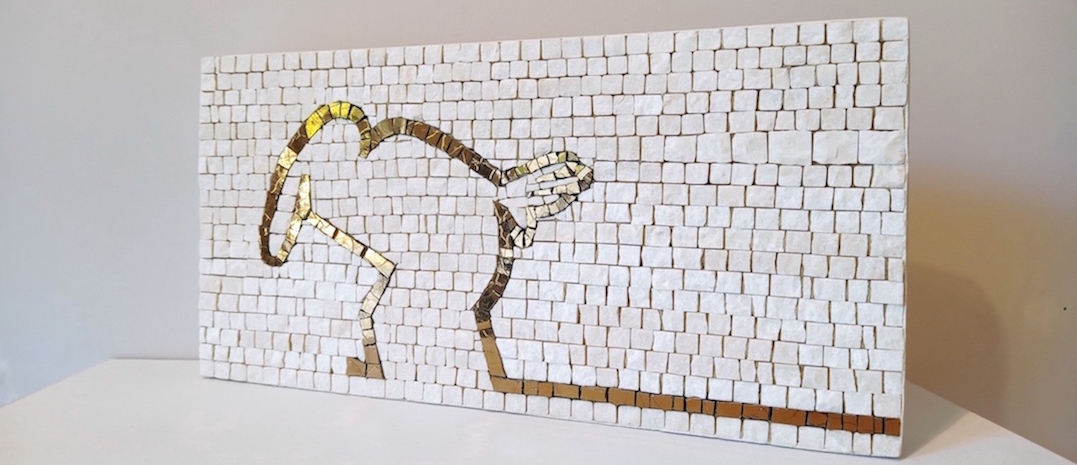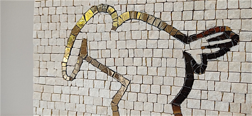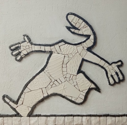 Il fondale regolare ad andamento orizzontale (con lo spacco a vista tipico della tecnica diretta) fa risaltare la superficie riflettente delle tessere di ceramica metallizzata usate per la silhouette dell’omino.