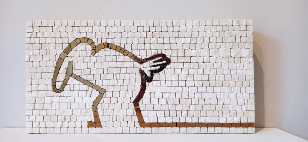 Ed è per questo che nel mio ultimo mosaico ho voluto apportare una variazione: il riempimento dell’omino con frammenti di ceramica bianca che hanno sulla superficie dei motivi geometrici. Ho poi finito il fondale spatolando del cemento bianco.