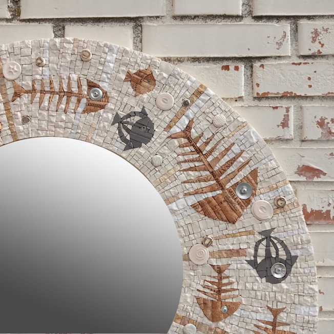 Mosaico rotondo di 80cm di diametro realizzato su una sagoma di legno nella quale ho ritagliato un foro centrale (leggermente eccentrico) di 40cm. Sul retro del tondo incollerò uno specchio per completare questo complemento d’arredo artistico di stile nautico.