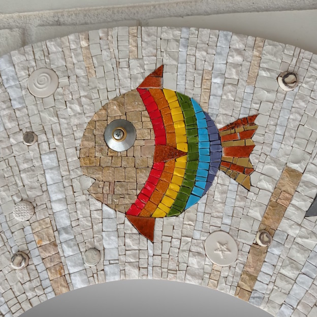 Il pesce arcobaleno (realizzato con smalti di Murano, frammenti di ceramica e tessere di marmo giallo) nuota controcorrente.