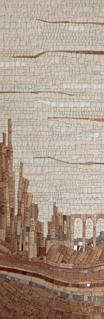I tappi del vino vengono ritagliati per utilizzare le diverse etichette (di Cantine soprattutto italiane) come tessere insolite che aggiungono elementi grafici alla trama musiva.