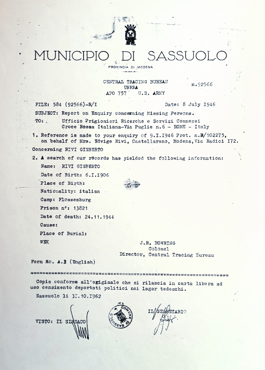 Ero con lei, all’Istituto Storico di Modena, quando ha aperto una cartellina con il nome del nonno, Gisberto Elia Rivi. Ricordo lo sguardo emozionato della mamma che, a quasi 70 anni, stava per rivedere il volto di suo papà! ma la busta (contrassegnata dalla dicitura -contiene 4 foto- )era vuota…