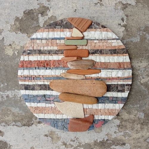 Astratto con conchiglie, ciottoli, tessere di marmo e frammenti di ceramica.