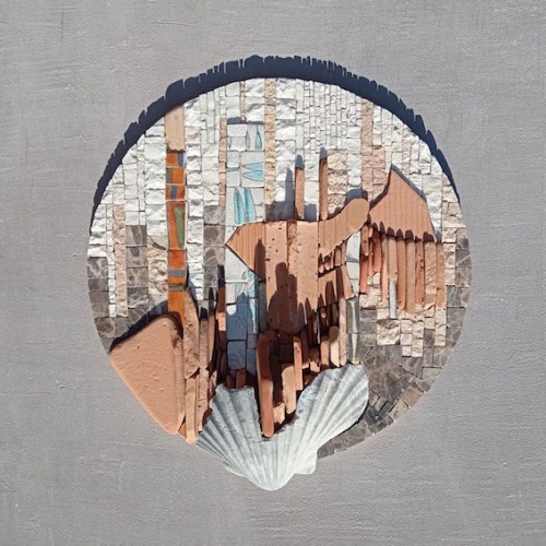 Una conchiglia di capesante, frammenti di laterizio trovati in spiaggia, tessere di marmo e ceramica. PHANTASIEN è un omaggio al libro di Michael Ende “La storia infinita” e nel crearlo immaginavo di guardare dall’alto un paesaggio di fantasia.